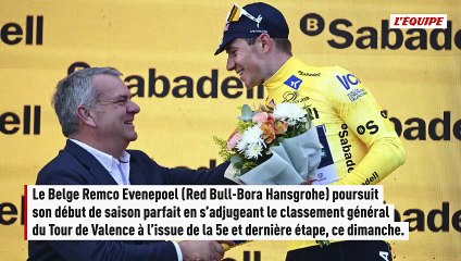 Le Belge Remco Evenepoel (Red Bull-Bora Hansgrohe) a assumé son statut de grand favori et poursuivi son début de saison parfait en s’adjugeant le classement général du Tour de Valence à l’issue de la 5e et dernière étape, ce dimanche. Survivant de l’échappée, l’Espagnol Raul Garcia Pierna (Movistar) a raflé le dernier bouquet.