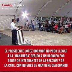 El presidente López Obrador no pudo llegar a la ‘mañanera’ debido a un bloqueo por parte de integrantes de la Sección 7 de la CNTE, con quienes se mantiene dialogando, informó el gobernador de Chiapas, Rutilio Escandón