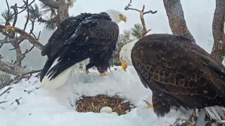 Bald eagles take care of eggs during California snowstorm