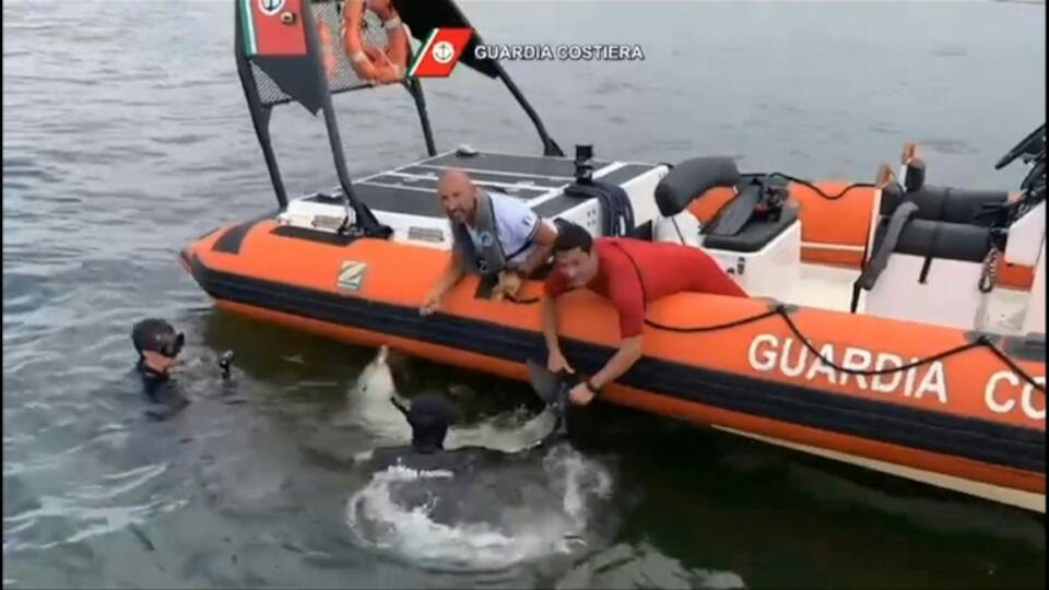Cagliari (Italy) (AFP) – A baby dolphin is rescued by coast guards on the Italian island of Sardinia after getting trapped in a nylon net.
